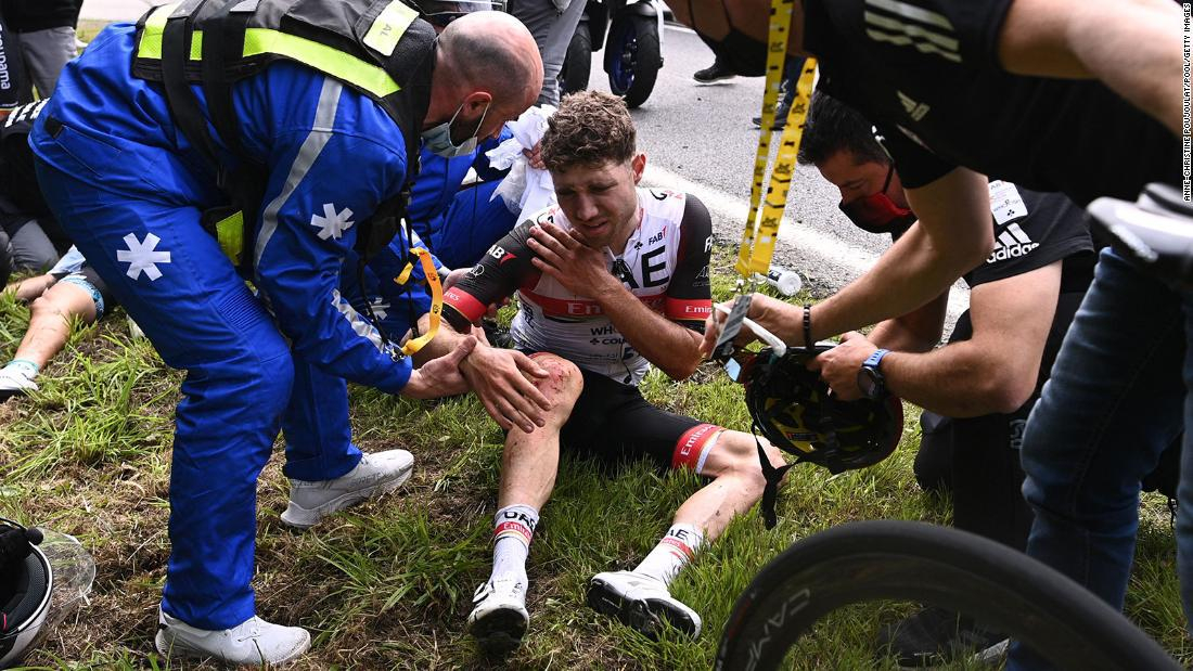 Los ciclistas cayeron en masa y el choque dejó bicicletas y cuerpos enredados en el camino. La caída retrasó la carrera durante varios minutos.