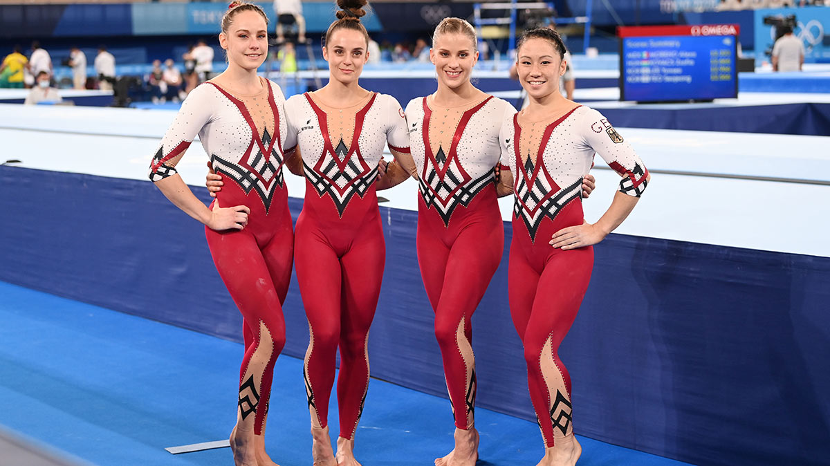 Elisabeth Seitz, Sarah Voss, Pauline Schaefer-Betz y Kim Bui llegaron a la última ronda de las clasificaciones luciendo trajes de cuerpo entero de colores rojo y blancos, cubriéndose piernas y brazos.