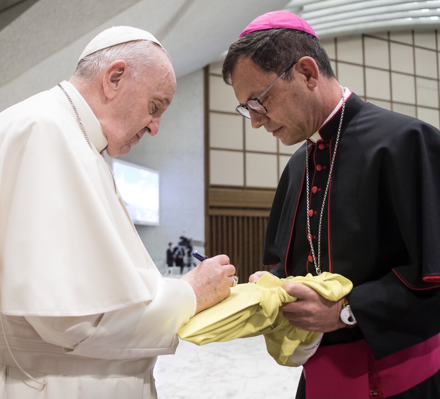 Por medio de unas fotografías se observa a ‘La pulga’ junto al Obispo Gobilliard de la diócesis de Lyon, brindándole al astro argentino el jersey que le mandó el Papa Francisco.