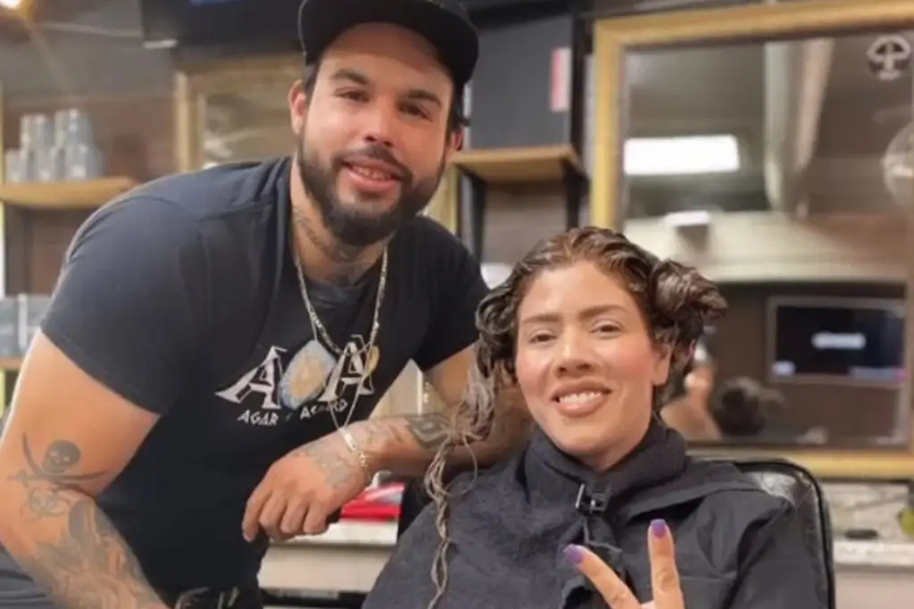 La imagen muestra a José Emiliano Aguilar Treviño y Rosa Isela Guzmán Ortiz en el interior de un salón de belleza en donde la joven se realiza un tratamiento en el pelo, ambos sonriendo.