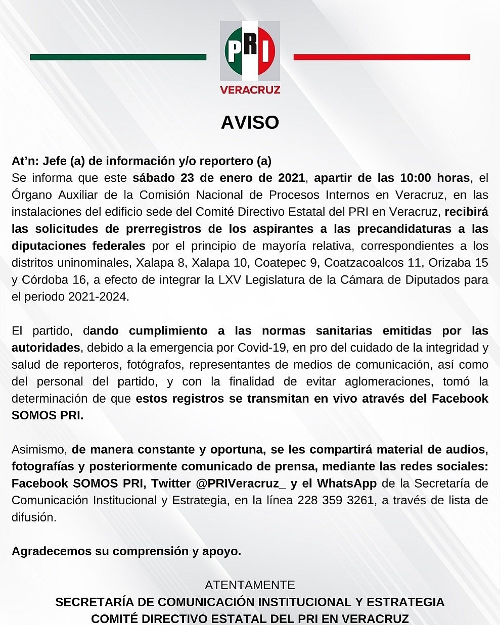 El Partido Revolucionario Institucional (PRI) de Veracruz anunció hace unos momentos a través de su cuenta de redes sociales que mañana estaría iniciando la recepción de documentación en los registros de precandidatos a diputados federales.