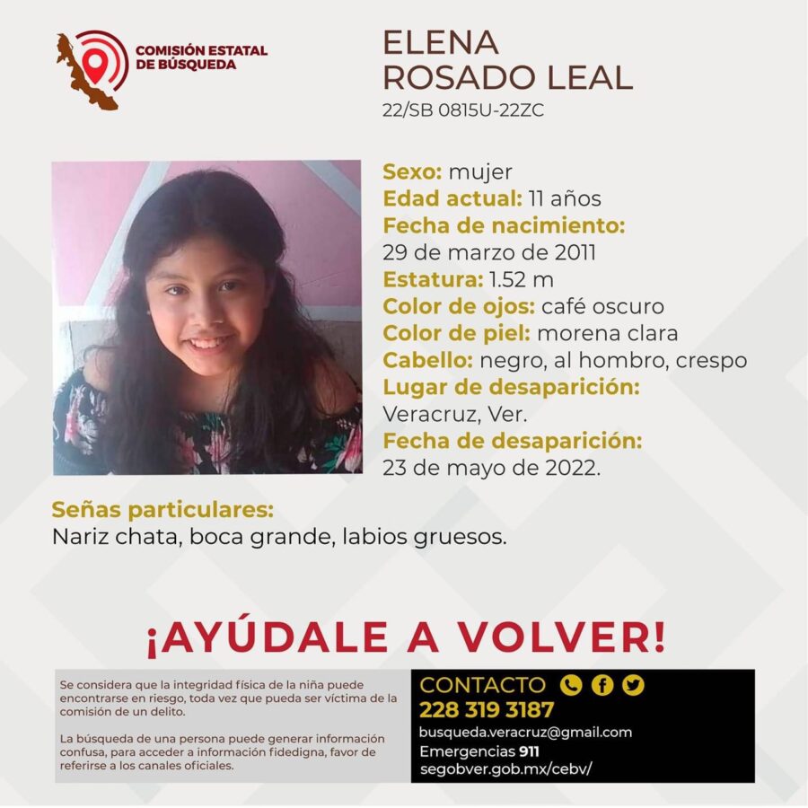 La Comisión Estatal de Búsqueda reportó la desaparición de una niña de 11 años en la ciudad de Veracruz.