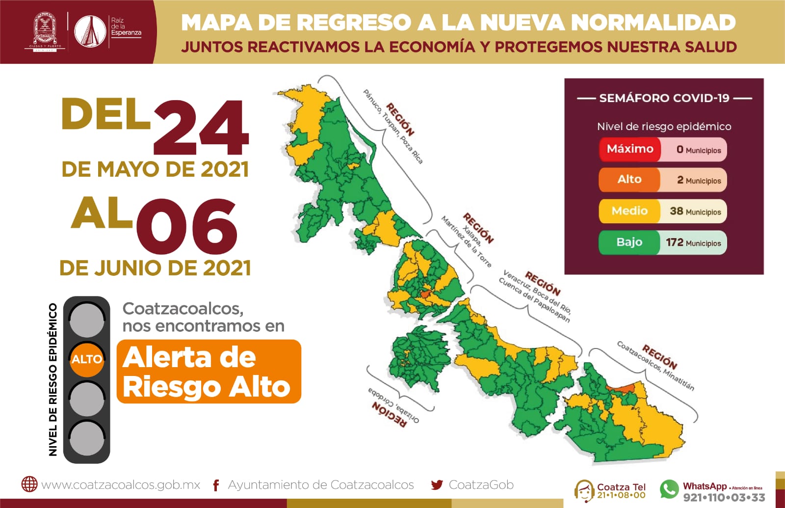 La Secretaría de Salud de Veracruz informó que sólo Xalapa y Coatzacoalcos pasarán a naranja y es necesaria la participación de todos para que no siga avanzando la propagación del COVID-19.