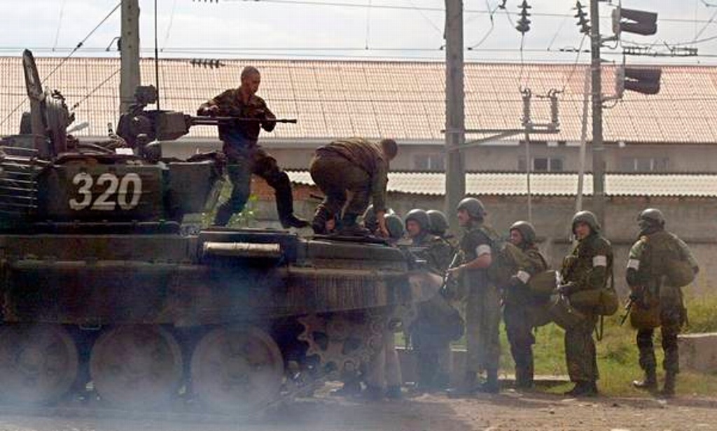 Commandos seen near a seized school in Beslan, North Ossetia, Friday, Sept. 3, 2004. Commandos stormed a school Friday in southern Russia where hundreds of hostages had been held for three days, sending hostage-takers and their captives fleeing in a scene of chaos amid explosions and gunfire. More than 100 children were wounded in the assault, some running from the building naked and covered in blood. (AP Photo/Sergey Ponomarev)