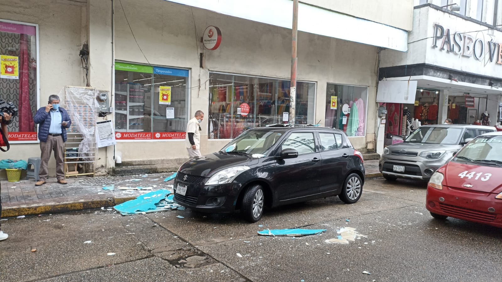 El pedazo de plafón provocó temor entre las personas que transitaban por el centro de la ciudad, toda vez que la estructura provocó daños a unidades que se encontraban estacionados frente a la tienda.
