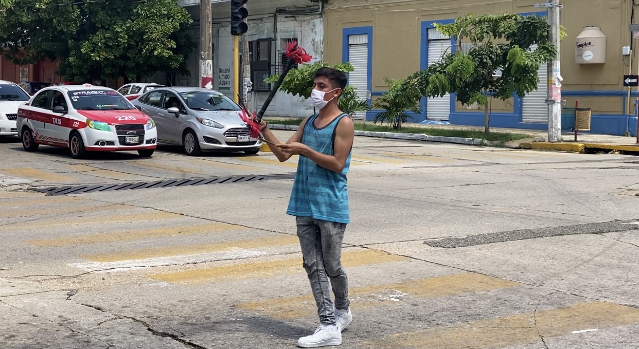 COATZACOALCOS, VER.- A través del arte urbano y el malabarismo José Salvador López Zamorano se gana la vida en los cruceros de Coatzacoalcos, desde que dejó su hogar cuando apenas era un adolescente.