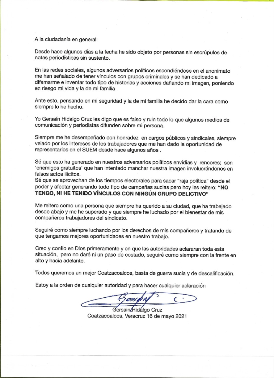 Coatzacoalcos, Ver. 17 de mayo de 2021.-En una carta dirigía a la ciudadanía, el líder del Sindicato Único de Trabajadores (SUEM) de Coatzacoalcos, Gersaín Hidalgo Cruz, aseguró ‘no tener ningún vínculo con grupo delictivo’ desmintiendo así los señalamientos infundados que circulan sobre su persona.