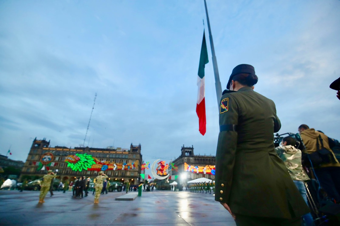 Elementos de las Fuerzas Armadas durante la ceremonia del izamiento de bandera a media asta en memoria de las víctimas de los sismos de 1985 y 2017 en la Plaza de la Constitución, el 19 de septiembre de 2021. Foto Luis Castillo.