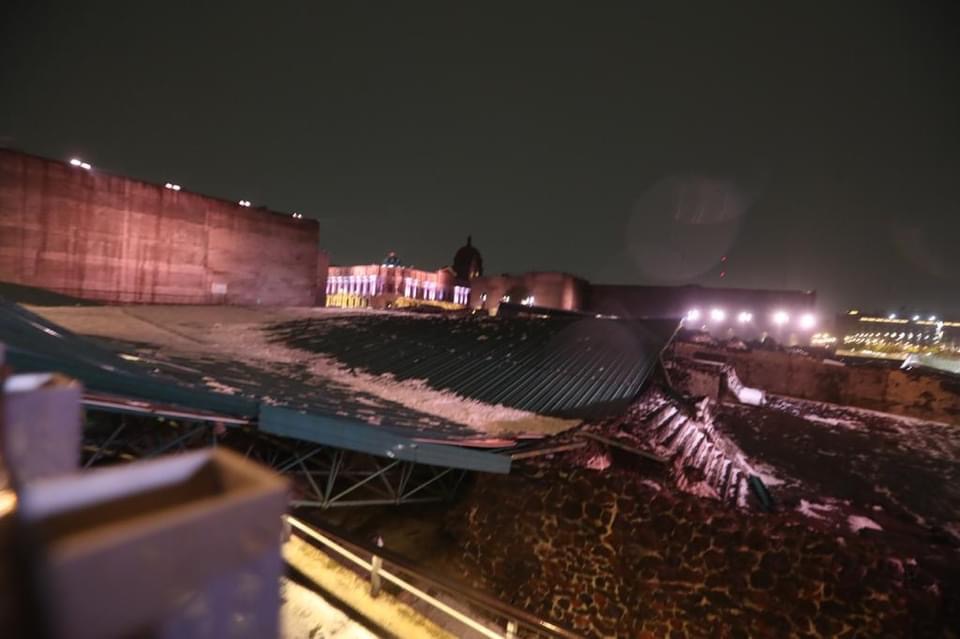 Una estructura colapsó sobre parte de la zona del Templo Mayor, tras la caída de granizo y fuertes lluvias que se registraron esta noche en diversas zonas de la Ciudad de México.