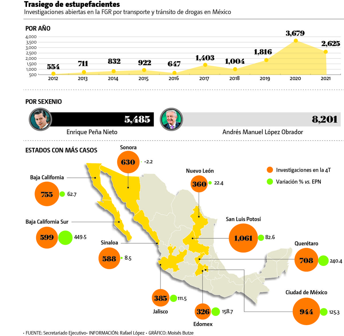 Por su parte, el actual secretario de Seguridad Ciudadana de la Ciudad de México, Omar García Harfuch, aseguró que ningún grupo criminal ha logrado asentarse en la capital del país: “es diferente que hayan hecho una transacción a que ya estén asentados y tengan estructura delictiva en la ciudad, eso es lo que con los grupos grandes no a ocurrido ni queremos que suceda”. Ante los dichos, las estadísticas oficiales muestran un aumento considerable del flujo de estupefacientes por las calles de la Ciudad de México, ya que en este sexenio se han denunciado 944 delitos federales por transporte y tránsito de drogas, lo que significa un aumento de 125 por ciento respecto a los 525 crímenes registrados entre diciembre de 2012 y noviembre de 2018. En Querétaro, una de las entidades más prósperas del país, los crímenes han crecido 240 por ciento en este sexenio, pues pasaron de 208 casos en la administración pasada a 708 delitos en la actual gestión, lo que significa un incremento de 240 por ciento. Otro estado que presenta un incremento desmedido en los delitos relacionados con el trasiego de estupefacientes es San Luis Potosí. Aquí las autoridades militares pasaron de atender 581 denuncias en el sexenio de Enrique Peña Nieto a mil 61 casos en los primeros tres años de la actual administración, lo que representa un incremento de 82.6 por ciento. Las alzas de las denuncias también se registran en Baja California Sur (449.5 por ciento), Estado de México (158.7 por ciento), Jalisco (111.5 por ciento), y Baja California (62 por ciento).