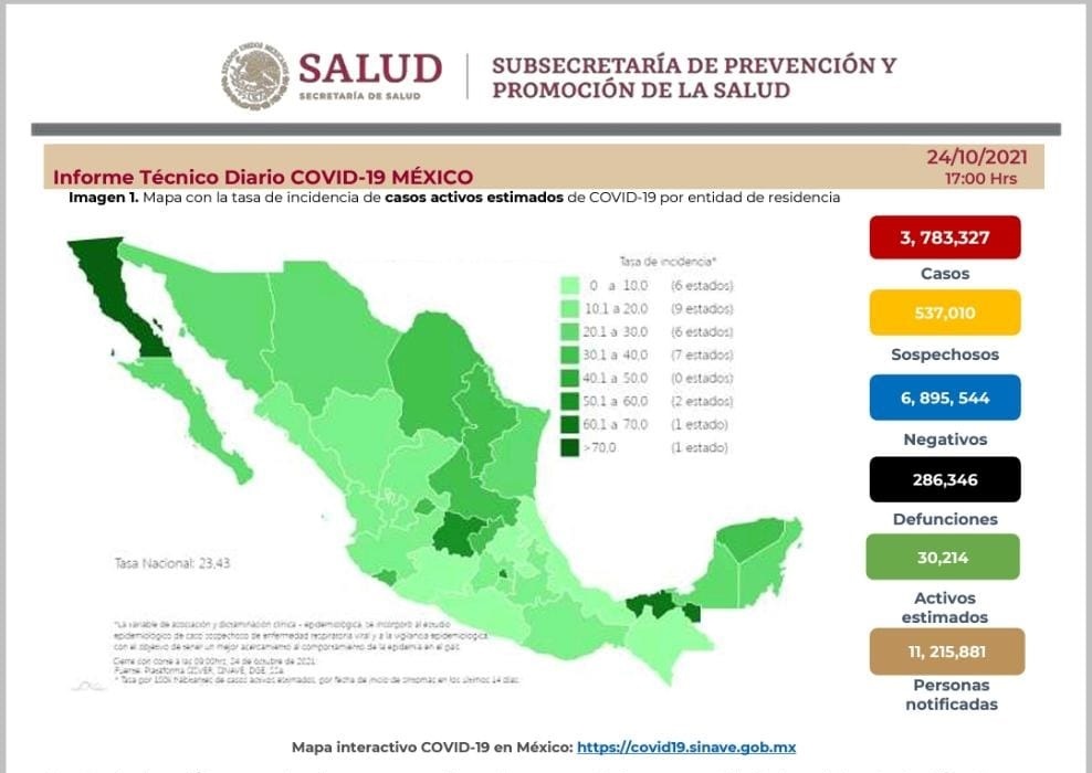 En México se han confirmado 3 millones 783 mil 327 casos de Covid-19 hasta el día de hoy, así como 286 mil 346 defunciones relacionadas a esa enfermedad, reportó la Secretaría de Salud federal (Ssa).