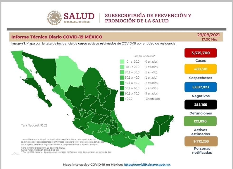 La Secretaría de Salud reportó que para este domingo suman 3 millones 335 mil 700 casos de Covid-19 confirmados, 6 mil 837 más que el sábado, mientras los decesos llegaron a 258 mil 165, lo cual representa 259 más que un día previo.