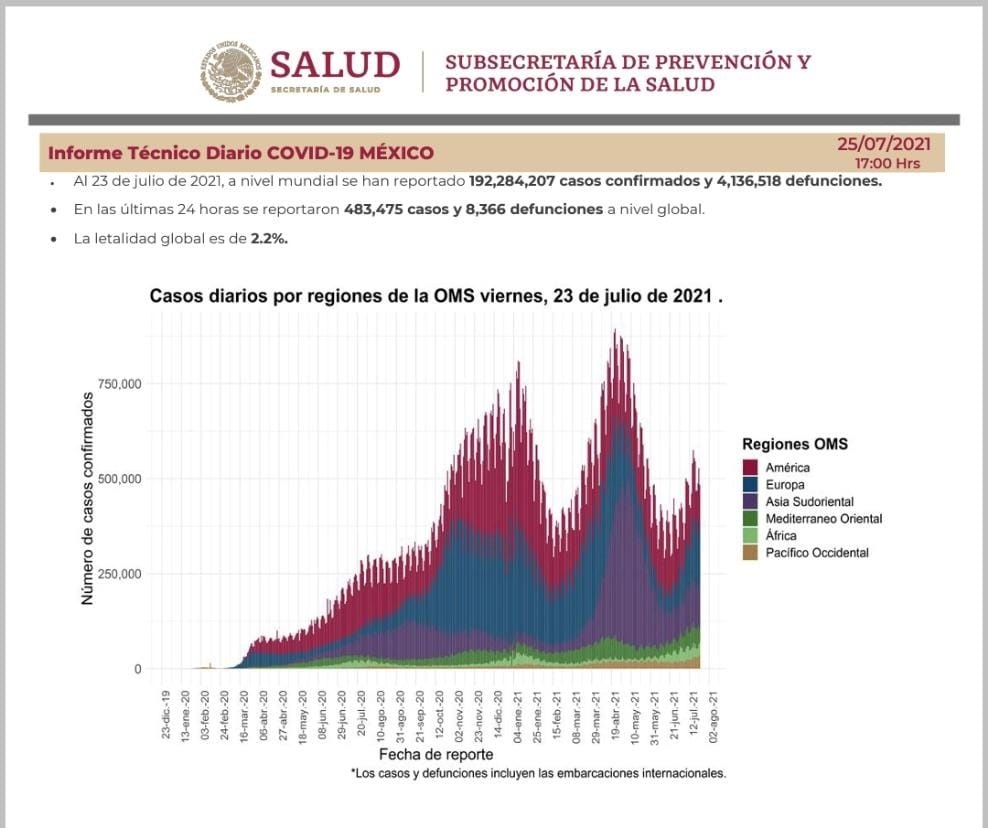 La Secretaría de Salud informó que este domingo suman 2 millones 748 mil 518 casos de Covid-19 confirmados, 6 mil 535 más que el sábado. En tanto, los decesos ascienden a 238 mil 424, 108 más que ayer. En total son 13 las entidades que superan los más de dos mil casos activos.