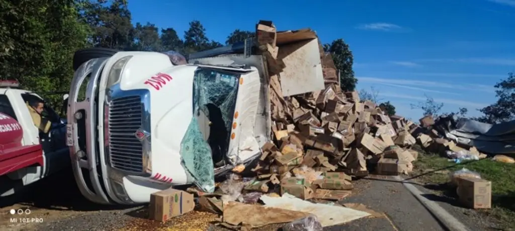 El camión tipo torton color blanco transportaba cereales, su destino final sería el municipio de Tlapacoyan, y con el accidente quedó esparcida la mercancía en la carpeta asfáltica.