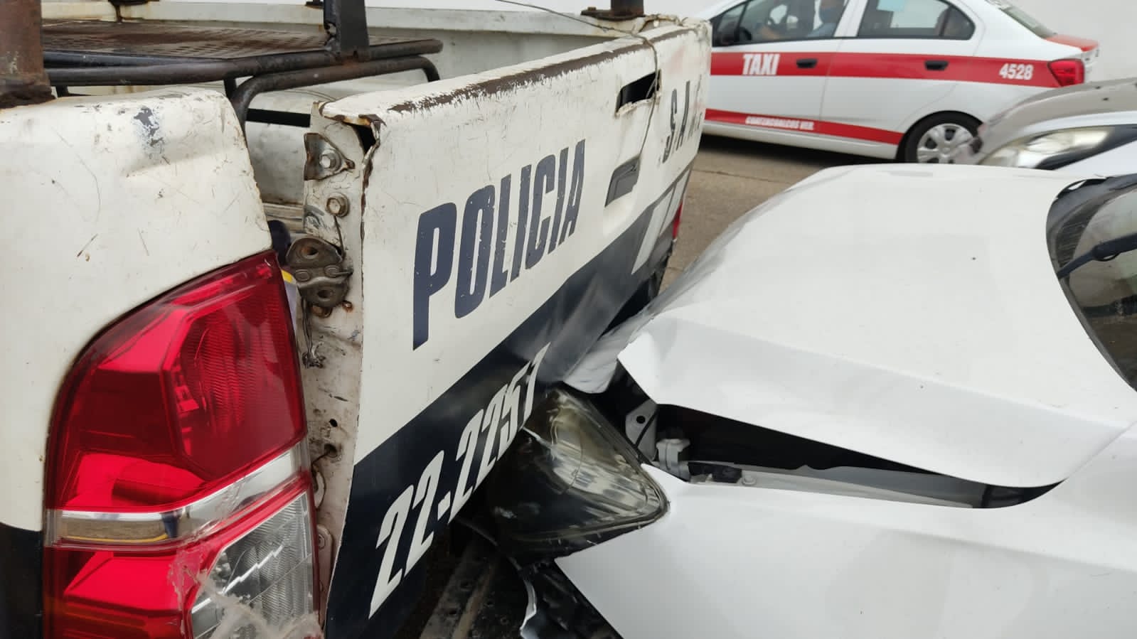Ambas unidades circulaban de poniente a oriente, cuando el coche color blanco de la marca aveo con placas del estado de Jalisco no frenó a tiempo y se impactó contra una patrulla marcada con el número 22-2257.