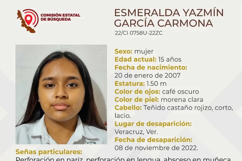 La Comisión Estatal de Búsqueda reportó la desaparición de una estudiante de 15 años de edad en el puerto de Veracruz.