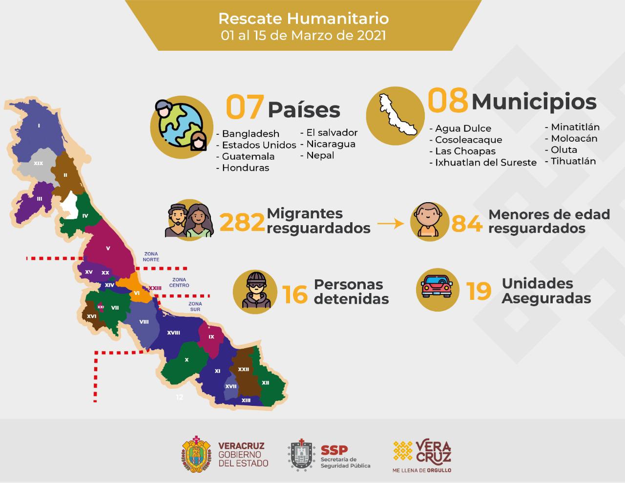 Xalapa, Ver., 17 de marzo de 2021.- La Secretaría de Seguridad Pública (SSP) informa que, del 01 al 13 de marzo, ha resguardado a 282 migrantes, entre ellos 84 menores de edad, procedentes de Bangladesh, Estados Unidos, Guatemala, Honduras, El Salvador, Nicaragua y Nepal.