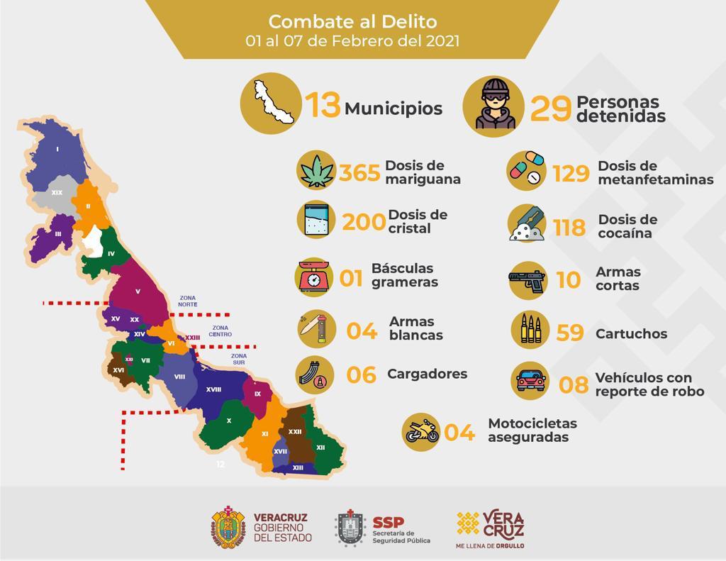 Xalapa, Ver., 08 de febrero de 2021.- Derivado de los operativos de vigilancia en el territorio veracruzano, implementados del 01 al 07 de febrero, la Secretaría de Seguridad Pública (SSP) realizó 29 detenciones en distintos municipios.