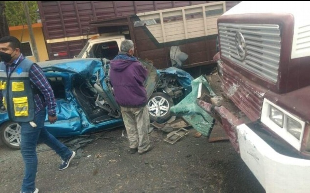 En el percance participó un vehículo Nissan Platina de color azul y con placas: YHT-2296 del Estado, un camión de carga tipo volteo marca Mercedes Benz con placas de circulación: XT-36-349 del Estado, una camioneta Ford de redilas de color café y placas de circulación XT-40-927 del Estado y un camión de carga tipo torton con doble jaula de color rojo.