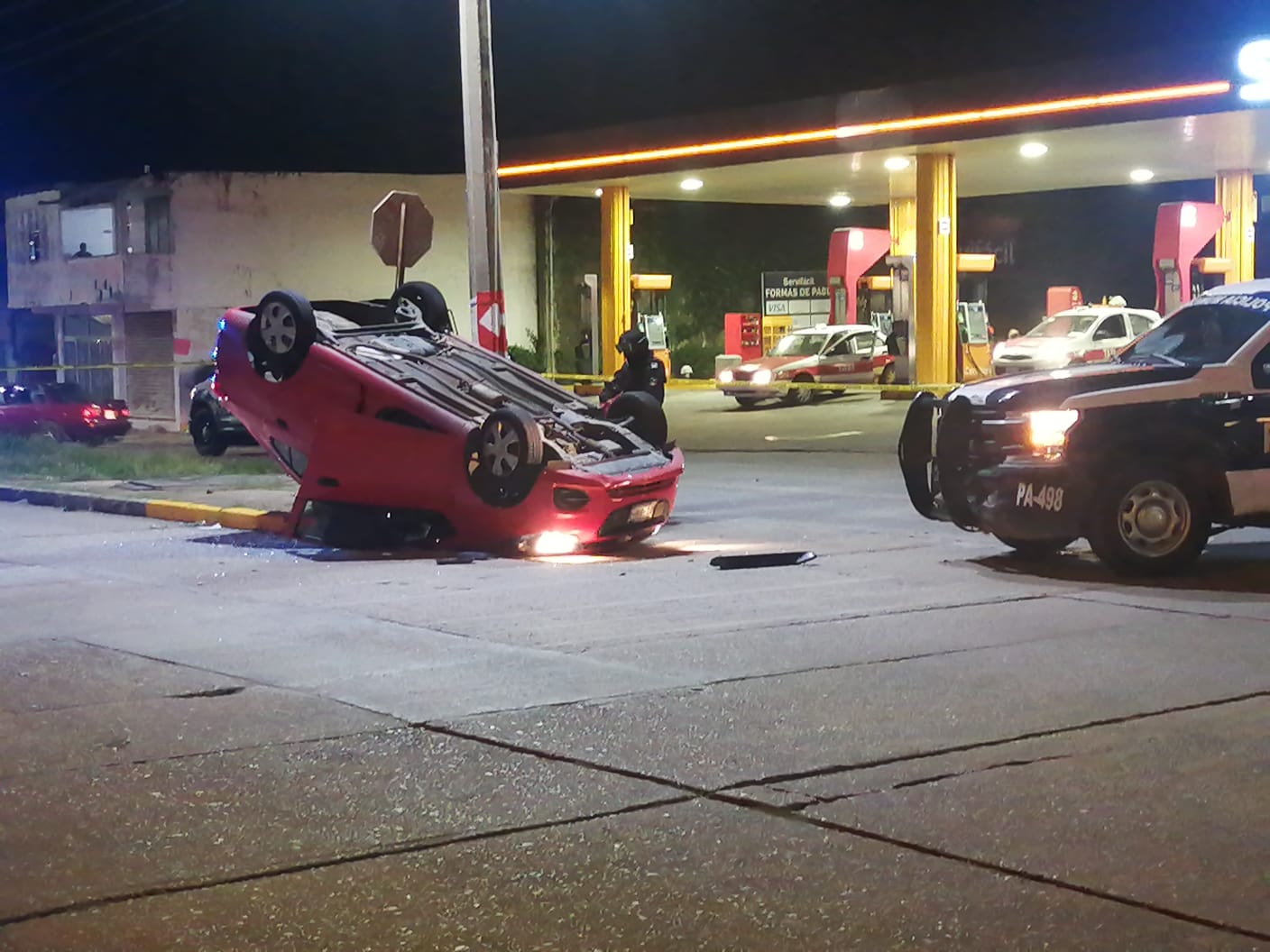 Coatzacoalcos, Ver.-Un automóvil Chevrolet Beat rojo terminó volcado tras impactarse con la patrulla policiaca PA498 en el cruce de Quevedo y Melchor Ocampo de la colonia María de la Piedad de esta ciudad.