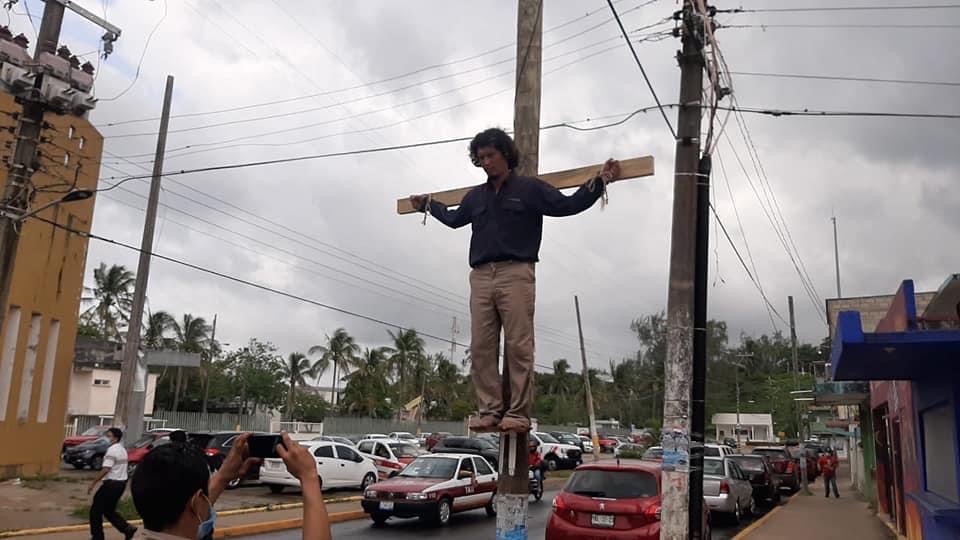 Dijo que desde hace un año no ha logrado contratar, por lo que ha optado por esta forma de solicitar un trabajo, haciéndolo semidesnudo y hasta amarrándose a un poste simulando estar crucificado.