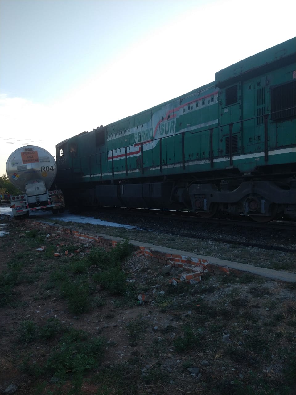 Chinameca, Ver. 18 de mayo de 2021.-Un carro tanque intento ganarle el paso al tren y terminó arrollada por la máquina, entre los límites del municipio de Oteapan y Chinameca al sur de Veracruz.